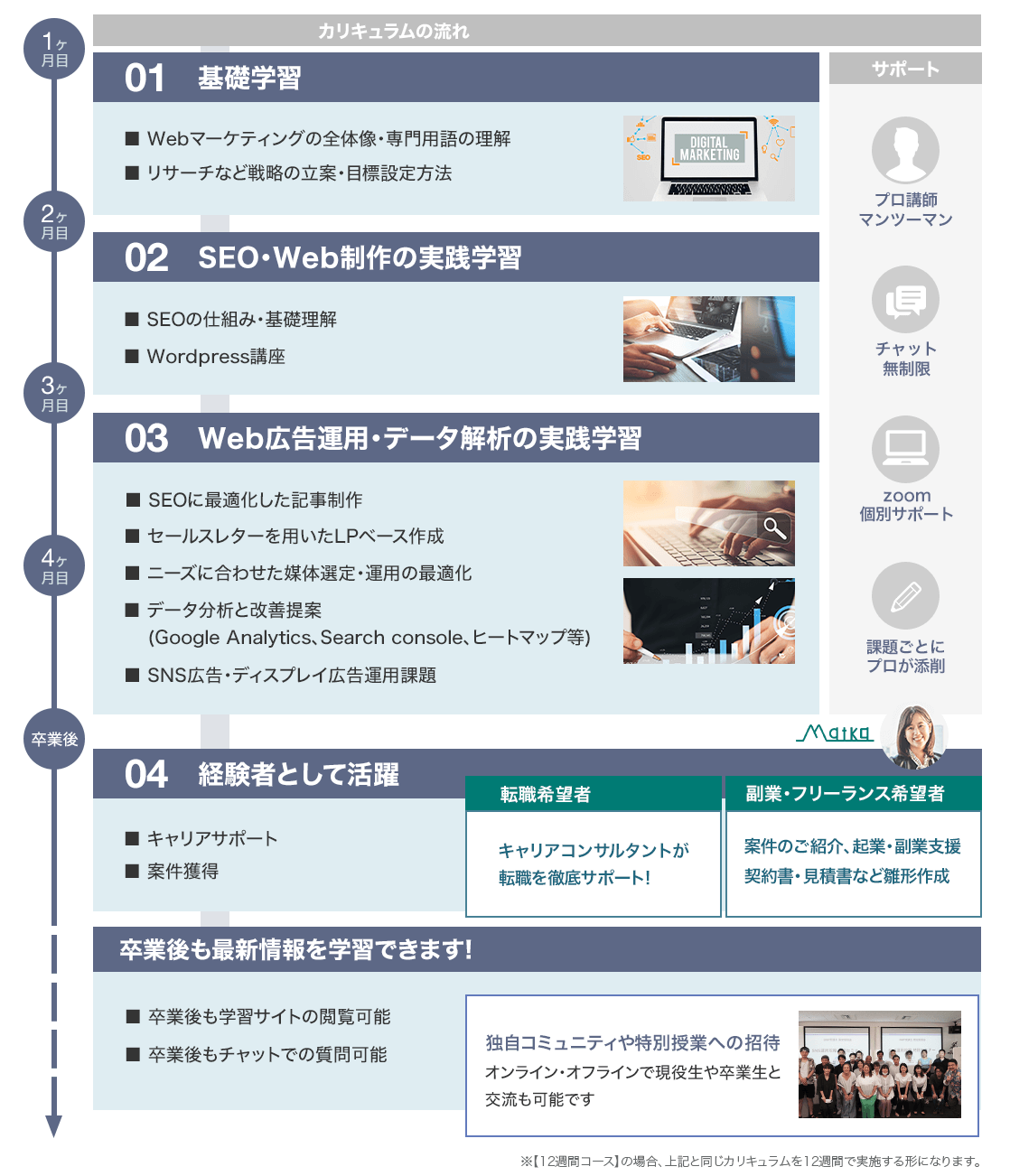Webマーケティングについて体系的に学ぶことができます。受講期間は3か月で、本業をしながら受講を進めるのは大変でした。また、実戦を意識した課題をこなすことで徐々に自信がついたので受講してよかったです!