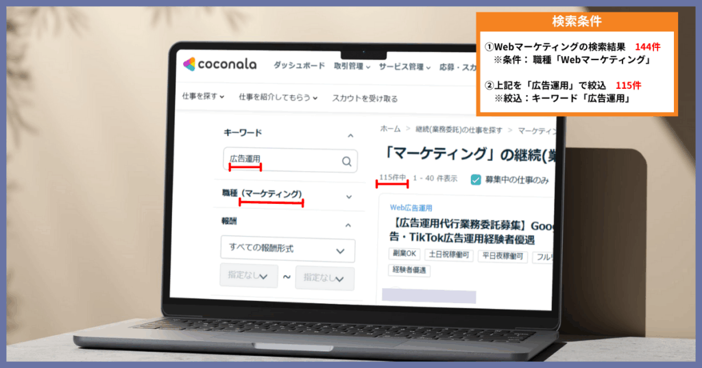 例えば、クラウドソーシングサイト「ココナラ」でWebマーケティングとして募集されている継続案件の約90%がWeb広告運用代行です。