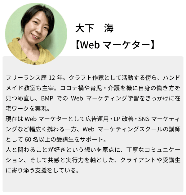 ちなみに、私もBMPの卒業生です。当時は「とにかく早くスキルと知識を身につけて、副業で1円でも成果を出したい!」という気持ちが非常に強かったため、迷わず「短期集中コース」を選びました。学習は少し大変でしたが、その分短期間で集中的に学べたので、結果的に大正解だったと感じています。