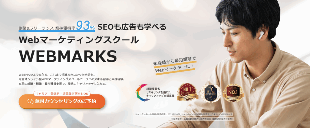 | WEBMARKS | 462,000円〜495,000円 | 3〜9ヶ月 | × | 案件獲得率93%、転職・副業両対応 |