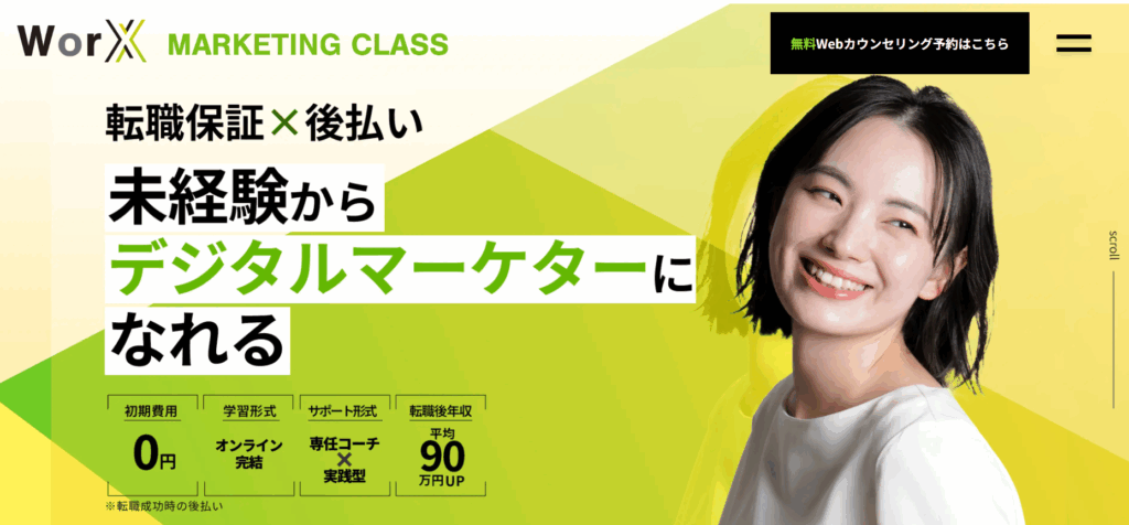 - DMM.comグループ運営で信頼性が高く、未経験から最短3ヶ月でWebマーケターへ。