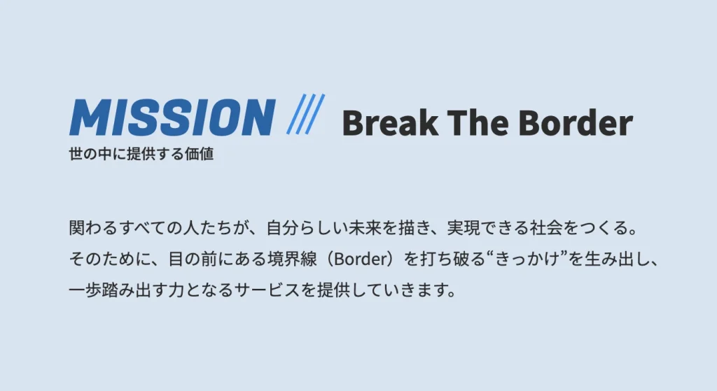 創業当初から掲げ続けてきた理念「Break The Border」挑戦を通じて、誰もが自らの可能性を広げられる世界へ。